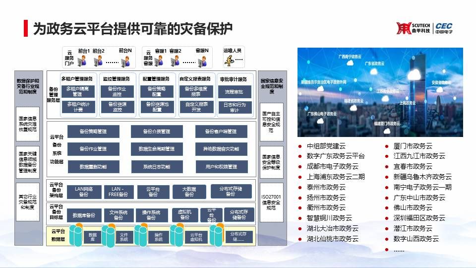 像某省電信的省級資源池的話,它包含不同的虛擬化平臺,我們鼎甲在這么多種云平臺底下,都能夠實現對所有數據的備份數據恢復和管理。