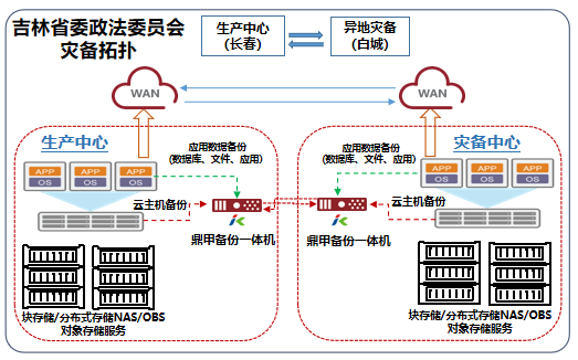 鼎甲在吉林省委政法委員會生產中心和災備中心部署了鼎甲純國產災備一體機(基于華為鯤鵬ARM架構),助力客戶高效實現“本地集中保護+異地容災保護”的項目建設目標。該方案具體部署如下: