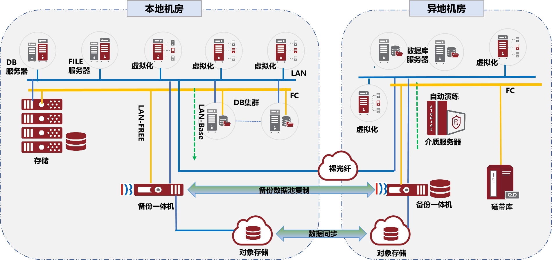 在客戶的同城和異地機房分別部署國產備份系統,逐步替換一直沿用的國外友商備份系統,不僅兼容麒麟、海光等純國產環境服務器,同時支持物理機、虛擬機等各種異構環境的備份要求,完全滿足現有業務系統的備份需求。