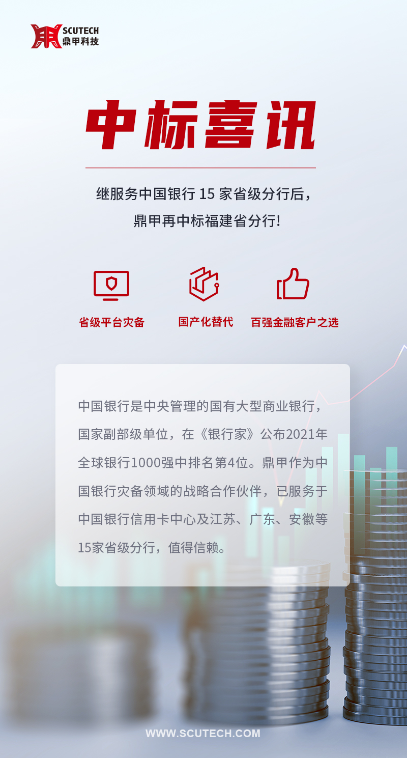 繼服務中國銀行15家省級分行后,鼎甲再中標福建省分行!