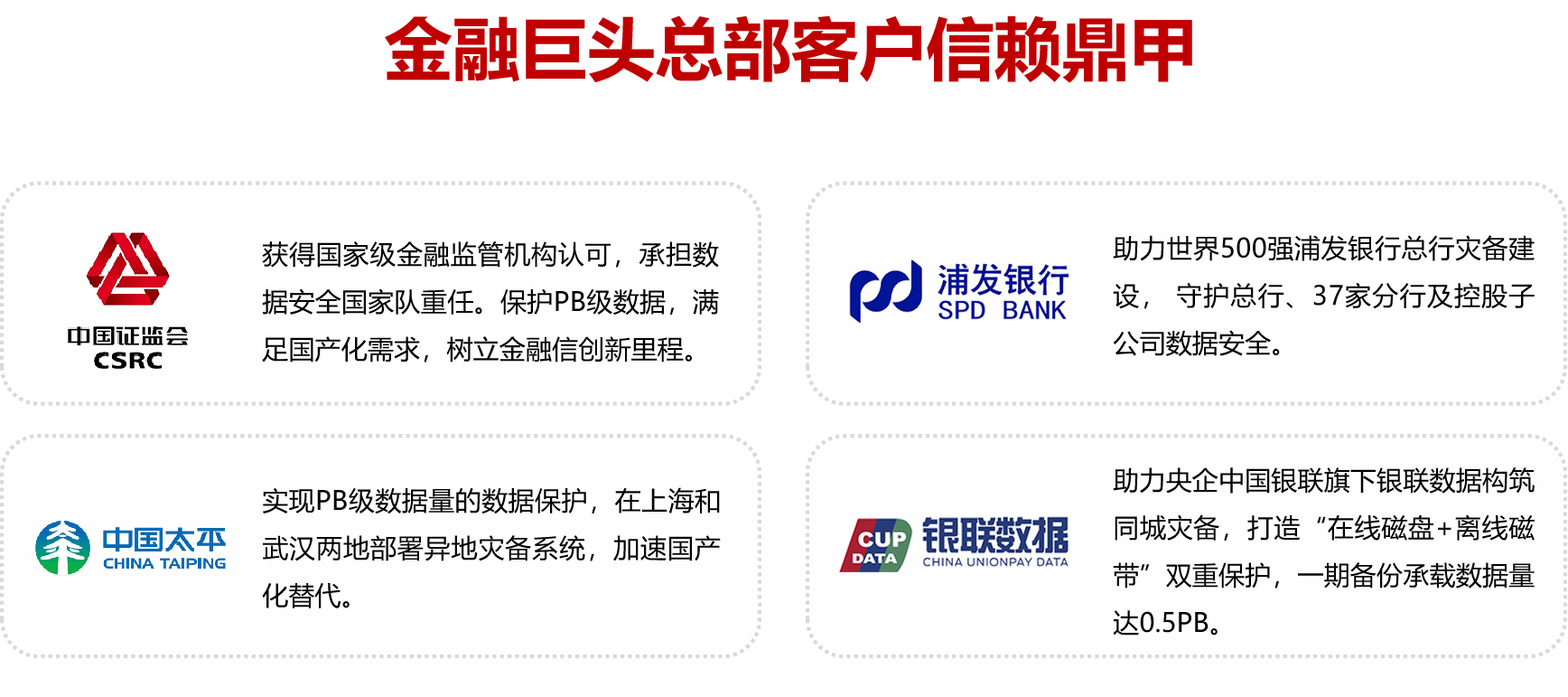 在重點深耕的金融領域,鼎甲一如既往承擔起挑大梁的重任,成績斐然:為中國工商銀行總部構筑兩地三中心災備,服務于中國銀行總行信用卡中心及眾多省市分行的信賴。不僅如此,中國證監會、興業銀行、浦發銀行、中國太平保險集團、銀聯數據等金融巨頭總部客戶,均紛紛信賴鼎甲,金融信創市場再提速。