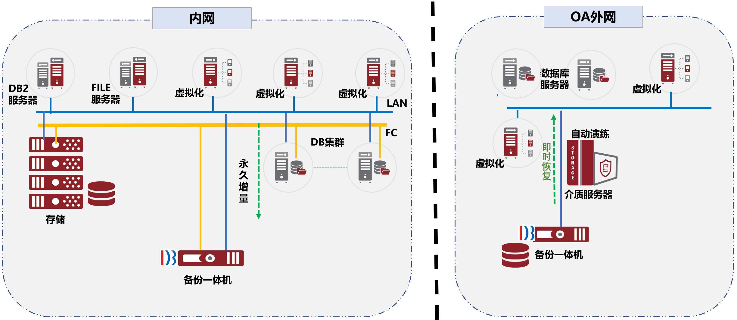 針對客戶需求,鼎甲將兩套備份一體機分別部署在生產(chǎn)環(huán)境與 OA 外網(wǎng),作為備份平臺的核心,負責(zé)管理整個備份環(huán)境,包括備份、存檔和還原,在確保業(yè)務(wù)管理系統(tǒng)數(shù)據(jù)安全性的同時,支持未來的業(yè)務(wù)拓展和新平臺上線的備份支撐。