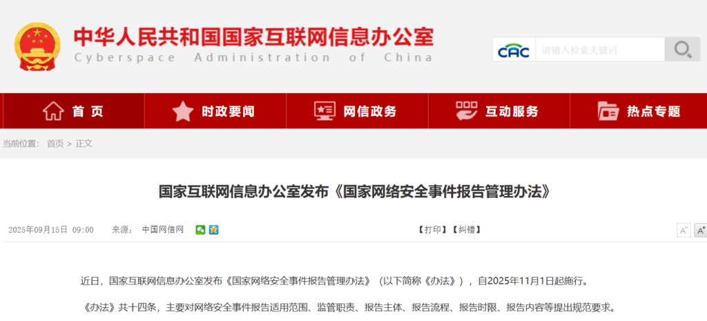 國家互聯網信息辦公室近日發布了《國家網絡安全事件報告管理辦法》,將于 2025 年 11 月 1 日正式實施。